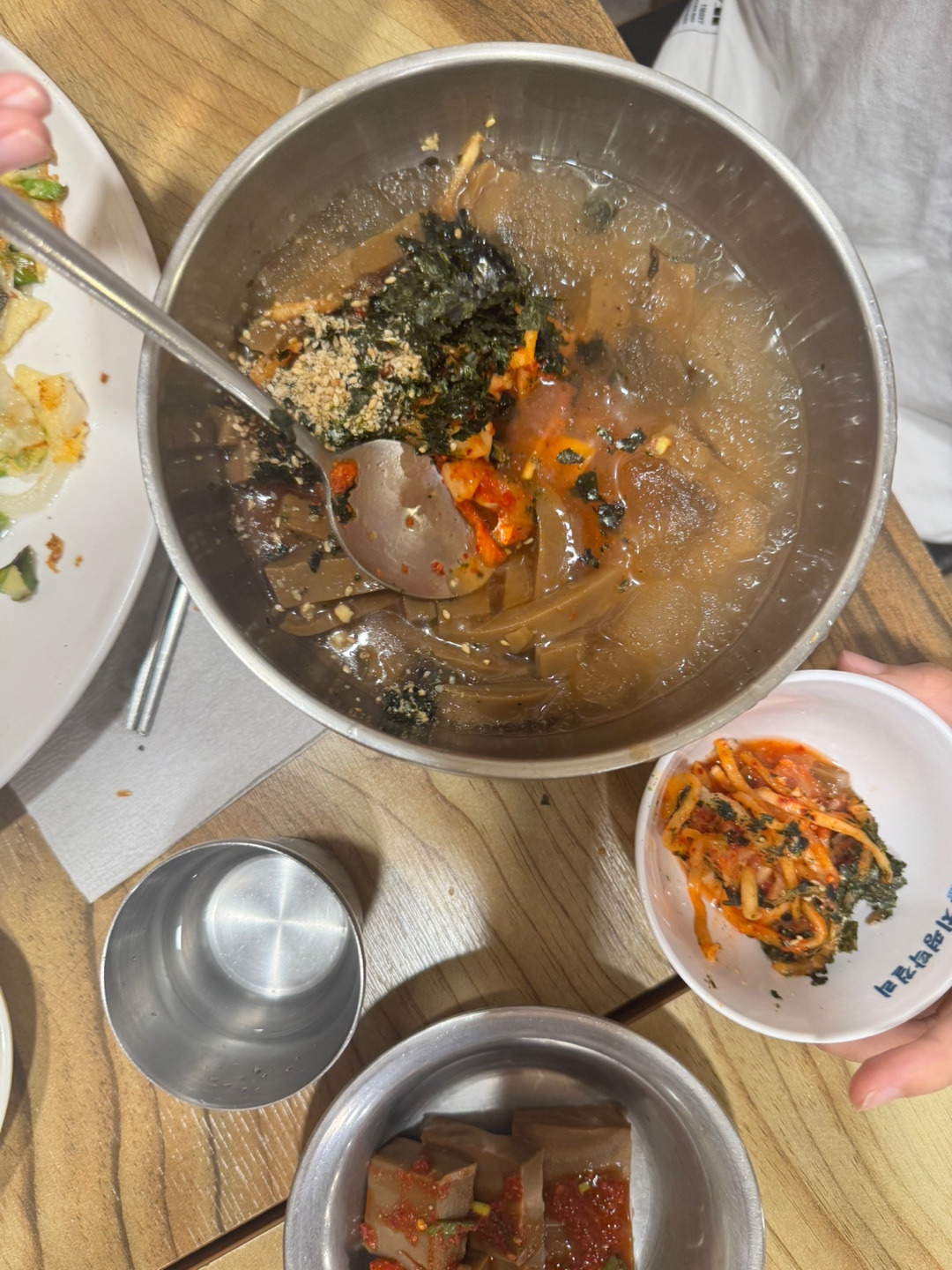 투박하지만 정갈한 큰 스테인리스 그릇에 담긴 도토리묵, 그 위에 김가루와 무생채, 참기름과 고춧가루가 어우러진 맛이 정말 맛있더라구요. 아들은 냉도토리묵밥, 저는 따뜻한 묵밥으로 시켰는데 따뜻하면 따뜻한대로, 차가우면 차가운대로 맛있더라구요.